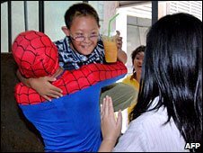 When the fireman showed up in the window wearing the Spiderman suit the young boy smiled, and climbed into his arms. He was rescued by Spiderman.